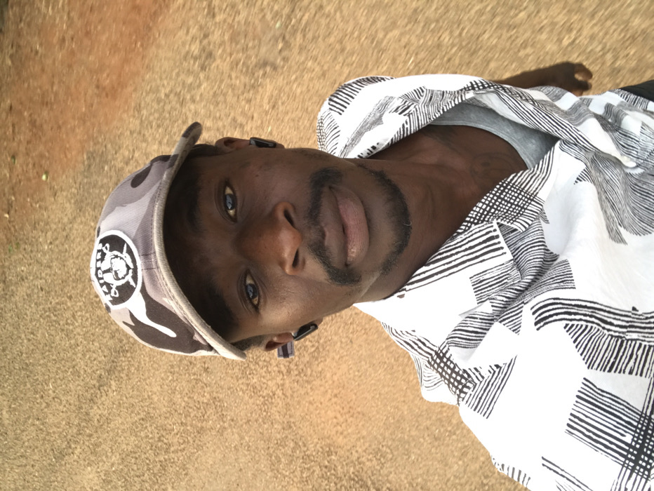 A man with dark skin and a goatee, wearing a grey, white, and black patterned cap, is angled slightly upward in the photo