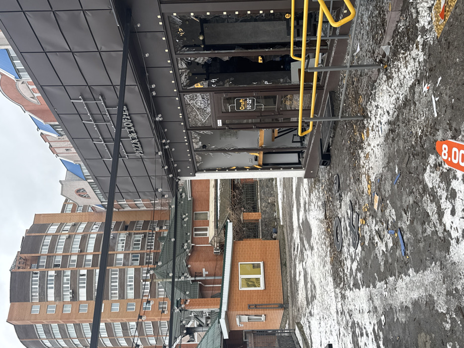 The image displays a street scene in Bila Tserkva, Ukraine, on an overcast day with patches of snow and ice on the ground. In the foreground, a commercial storefront building with dark paneling shows extensive damage. Its large glass display windows are shattered, with significant portions missing and broken glass shards visible on the ground directly in front. A sign on the building's facade reads "PIZZA & COFFEE," and a sign on the entrance door, also damaged, states "Craft 10-22." Detached pieces of signage, including letters and an orange sign displaying "8.00," are scattered among other debris on the soiled pavement. A yellow metal handrail runs along the base of the damaged storefront. To the left, a small, intact building constructed of orange brick with a green roof stands. In the background, a tall, multi-story residential building of brown brick with numerous windows is prominent, alongside other lower-rise residential structures. String lights are suspended overhead, across the scene. No individuals are visible.