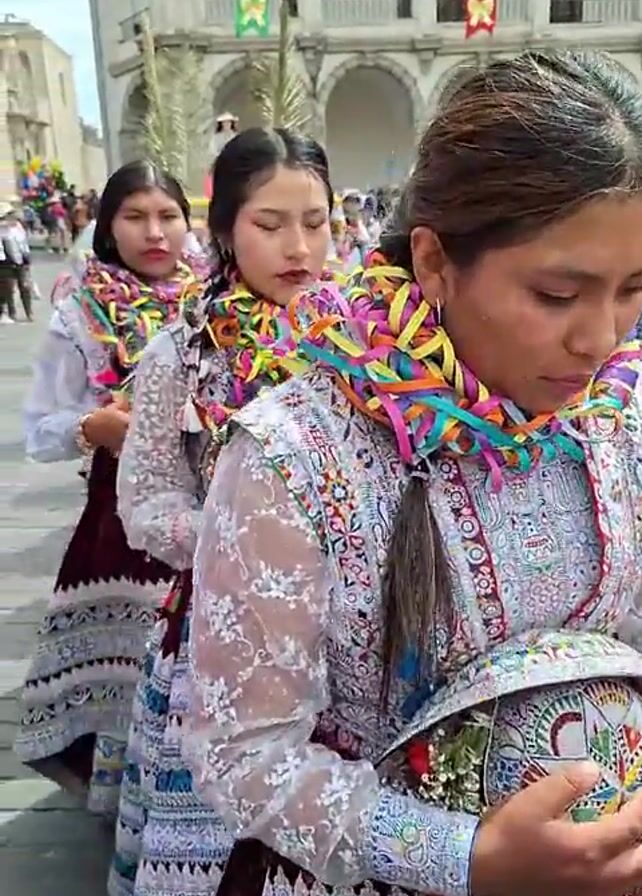 A medium shot shows a line of young women in colorful traditional dress walking in a paved square. They are wearing white lace blouses, and long, patterned skirts with bands of color. They are each wearing a colorful garland of paper ribbons around their necks and carrying a decorated bowl in their hands. The women have dark hair and complexions. Behind them is a light-colored building with arches. Other people are in the background, including some men in baseball caps.