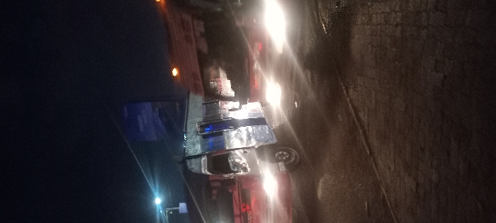 A silver truck is seen amidst a row of cars on a dark, wet road at night. The car lights create bright reflections on the wet surface, obscuring details of the surroundings. The image has a grainy quality.