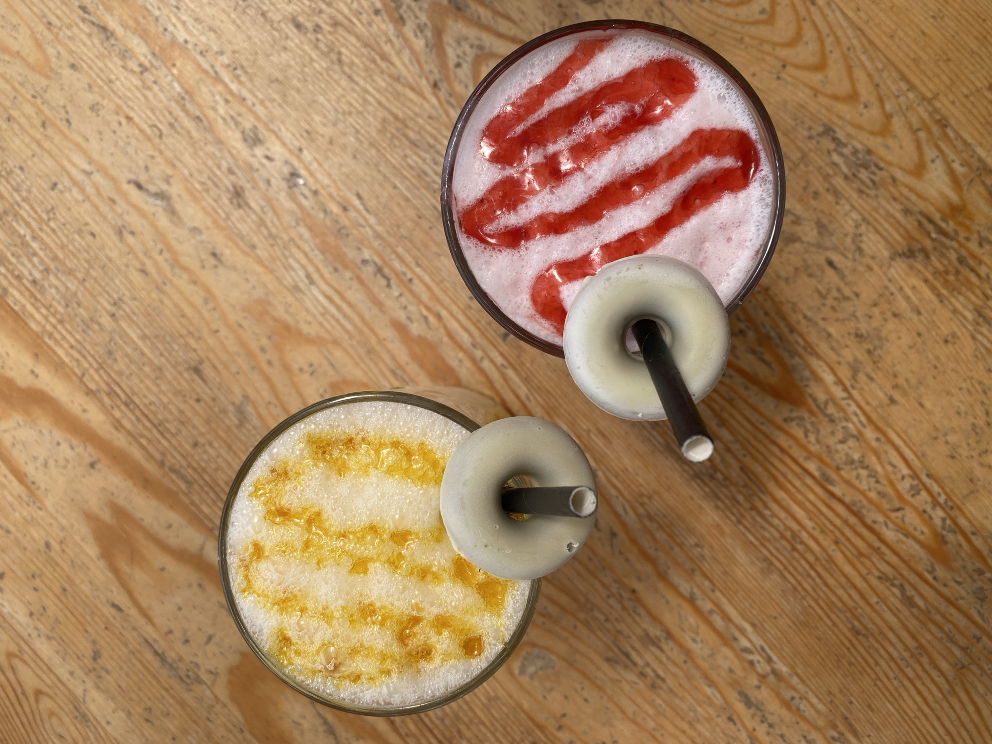 Two glasses of drinks are positioned on a light-colored wooden table. The glass in the upper-right contains a white frothy drink with red stripes on top. A white doughnut with a black straw going through it sits on the rim of the glass. The glass in the lower-left contains a white frothy drink with yellow stripes on top. A white doughnut with a black straw going through it also sits on the rim of that glass. The location is unspecified but the request mentioned the city of Teguise, Spain. There are no people in the image.