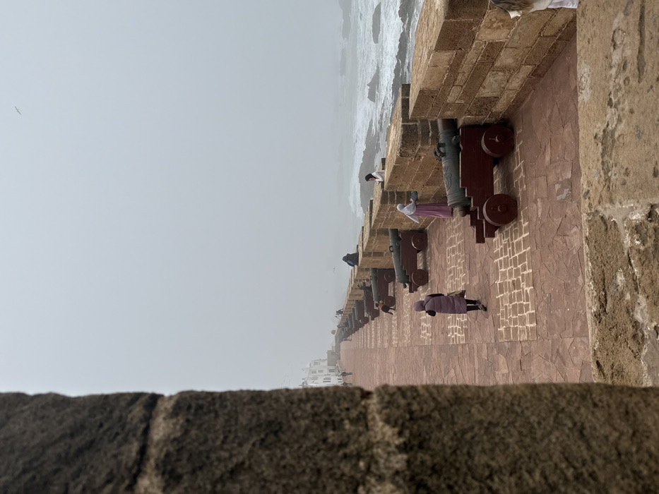 A row of cannons faces the ocean along a stone wall. Several people are walking along the path beside the cannons. The ocean waves crash against the wall. The sky is overcast. The viewpoint is from a higher wall. The stone wall is made of dark bricks, and the walkway is tiled in red.