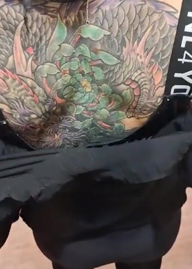 A woman with a large, colorful back tattoo is lowering a black garment to reveal the tattoo. The tattoo features a dragon, flowers, and other design elements. She is wearing a black sports bra with white text on the straps. She is standing in what appears to be a kitchen, with a sink and countertop visible in the background. The lighting is somewhat dim.
