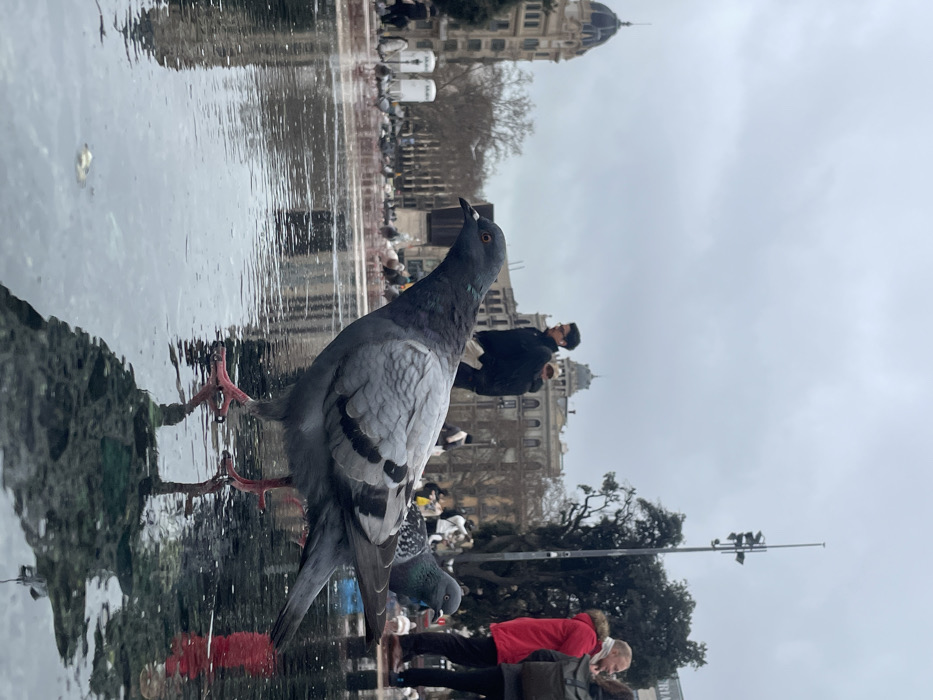 - "A gray and black rock dove (pigeon) stands prominently in the immediate foreground, facing left, on a wet, reflective black-paved surface" by FM-T5EOT2, licensed under CC BY 4.0