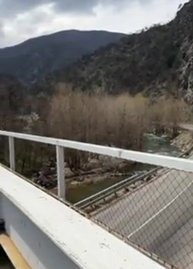 The camera pans from a bridge railing overlooking a winding road and river to reveal a railroad bridge