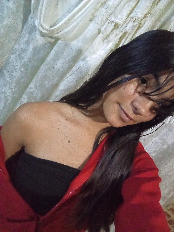 A young woman poses for a selfie. She has dark, straight hair with bangs partially obscuring her face. She wears a black strapless top and an unzipped red jacket. Her bare shoulder is visible. The background features a patterned, off-white curtain. The lighting creates soft shadows on her face and shoulder.