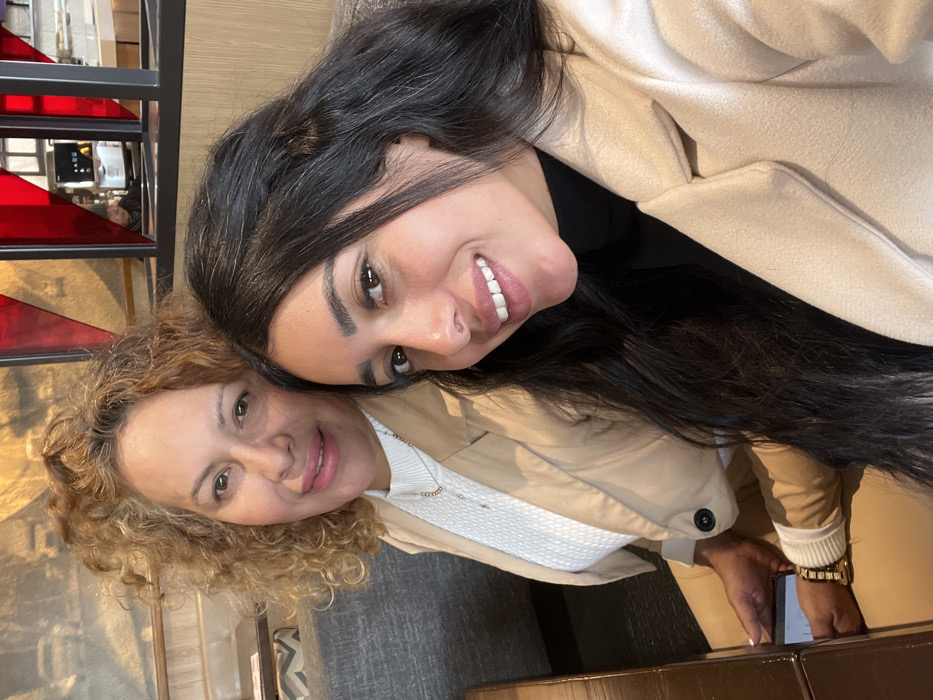 Two women are posing closely together. The woman on the left has curly blonde hair and wears a white top and a beige jacket. The woman on the right has long black hair and wears a black top and a beige jacket. Both are smiling at the camera. In the background, part of a staircase and some furniture are visible.