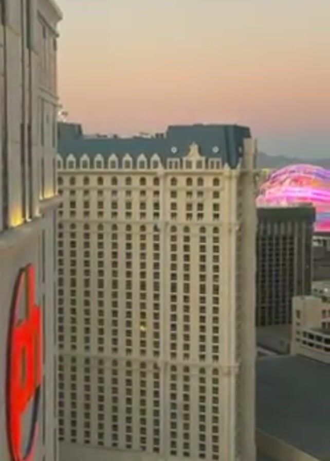 tall, white hotel building with many windows. Next to it, there is another building with a large red logo. In the background, there's a dome-shaped structure displaying colorful lights. The sky is light pink and light blue from the sunrise. There are additional buildings and what appears to be a parking garage visible in the distance. The perspective is from an elevated position.