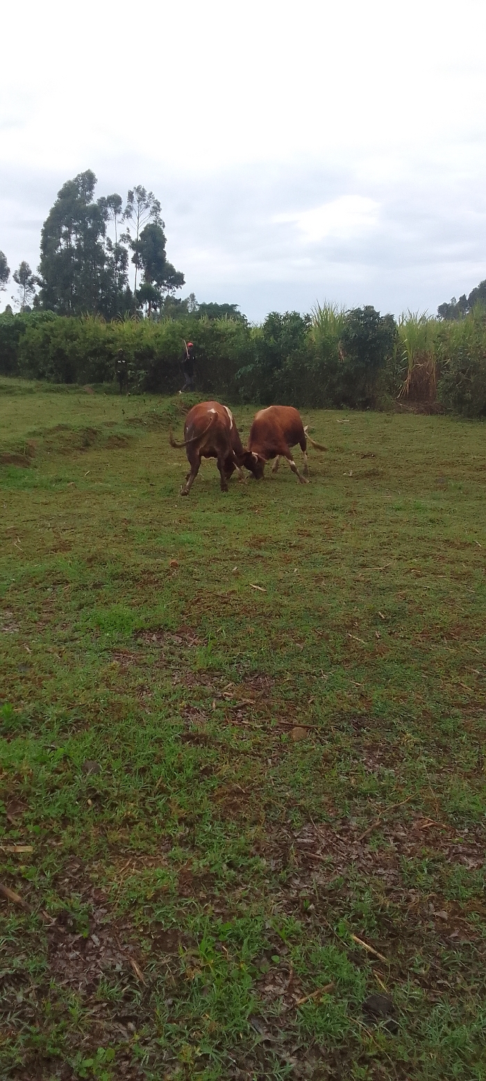 Two brown and white bulls are butting heads in a grassy field. The bulls are facing each other, with their horns locked. They are both standing on their hind legs, and their front legs are raised in the air. The ground is covered in short, green grass. In the background, there are trees and bushes. The location is a grassy field on the outskirts of Burundu, Kenya. The coordinates of the location are latitude: 0.396, longitude: 34.779. A person is barely visible in the background, walking towards the left of the frame.