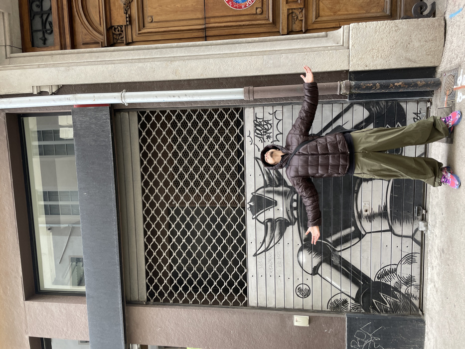 In the city of Lyon, France, an individual stands centered in an urban street scene. The person is an adult, wearing a dark brown hooded puffer jacket with the hood up, a black t-shirt underneath, loose-fitting olive green cargo pants, and brightly colored athletic shoes, primarily pink and purple. A black cross-body bag is worn over their right shoulder. The individual's head is tilted sharply upwards, looking towards the sky, and both arms are outstretched laterally at shoulder height with palms facing upwards. Behind the person is the facade of a building. A metal security roller shutter is partially lowered over a storefront opening. The upper section of the shutter features a diamond-pattern mesh, while the lower solid section is adorned with black graffiti. This graffiti depicts a large, stylized robot head and torso, resembling Grendizer, with angular horns and prominent shoulders. Additional text-based graffiti tags, including "JooR" and "NEA," are present around the robot. Above the roller shutter, a dark horizontal sign structure extends across the facade, with a large, reflective window situated above it, showing reflections of other buildings. To the immediate right of the person, a white vertical drainpipe is affixed to a brown section of the building facade. Adjacent to this, an ornate dark brown wooden double door with carved details and a decorative transom is visible, set into a light-colored stone facade. A circular red, white, and blue sticker is affixed to the right panel of the wooden door. The ground beneath the person is light gray pavement. The scene is illuminated by diffused natural light.