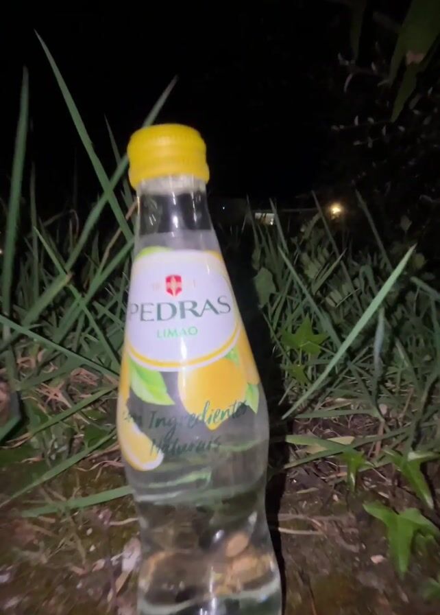 A glass bottle of Pedras Limão soda is on a mossy surface at night. The bottle is clear with a yellow cap and a label featuring lemons. The background includes grass and the faint light of a distant house. The camera zooms out from the bottle.