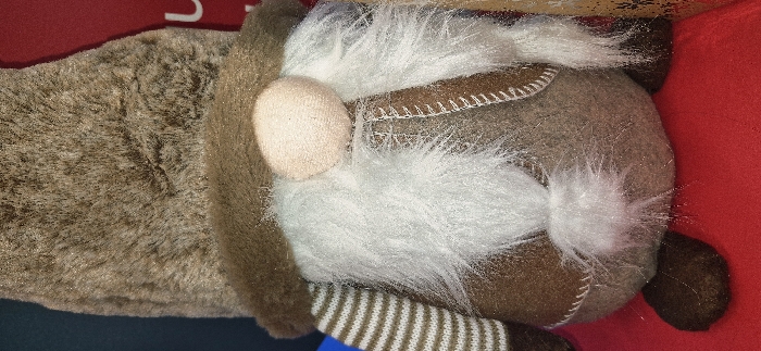 This image depicts a close-up, front-facing view of a decorative gnome figure, positioned within an indoor setting in the city of Vendin-le-Vieil, France. The gnome features a tall, conical, light brown faux-fur hat with visible glitter, resting above a darker brown, plush brim. A light beige, round fabric nose protrudes centrally below the hat. A prominent white faux-fur beard, also interspersed with silver glitter threads, extends downward from the nose, covering the majority of the gnome's upper body. The gnome's body is constructed from various fabric textures. The visible left arm is clad in a brown and white horizontally striped knitted sleeve. The central body and right side are composed of a brown fabric, with white decorative stitching in a zigzag pattern running vertically down the right side. The lower body appears to be a lighter brown or grayish fabric, from which a smaller tuft of white, glittery faux fur protrudes centrally. Two small, dark brown, rounded fabric feet are visible at the base. The figure rests on a bright red, textured surface. The background behind the gnome is bifurcated, showing a dark blue or black surface on the left and a red surface with a partial white letter or symbol (resembling the top curve of an 'L') on the right.