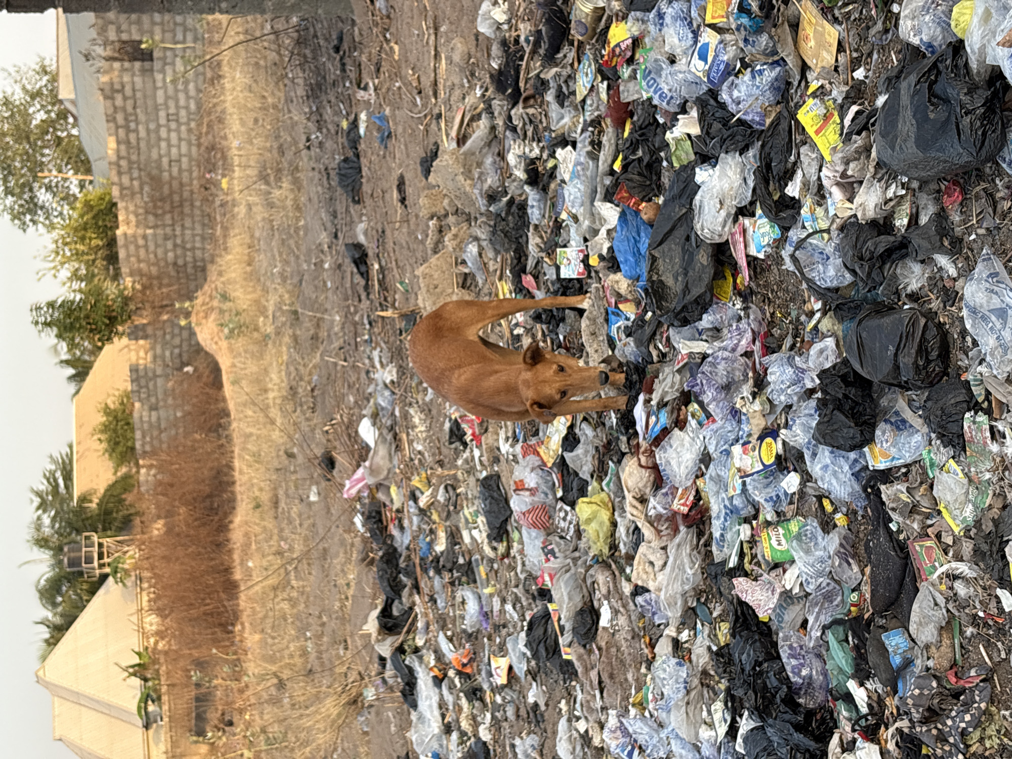 A medium-sized, light brown dog with short fur is depicted in the foreground, standing amidst a large accumulation of refuse