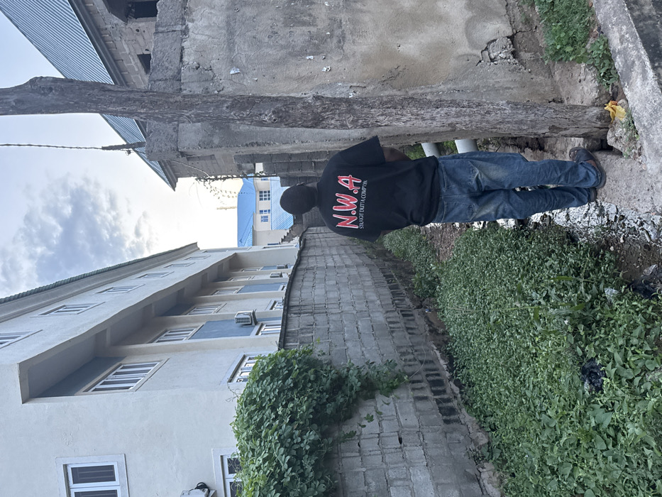 The image captures an outdoor scene in Lokoja, Nigeria, looking down a narrow passage or alleyway. A single male subject, seen from behind, occupies the foreground. He wears a black short-sleeved t-shirt with "N.W.A" in red lettering and "STRAIGHT OUTTA COMPTON" in white lettering below it, blue jeans, and dark open-toed footwear. A dark-colored beanie or cap covers his head. The subject stands on a concrete edge, facing away from the camera, and appears to be urinating into the drainage ditch directly in front of him. To the left, a multi-story building with a light-colored facade, numerous white-framed windows, and light blue vertical accent panels extends along the passage. Several external air conditioning units are affixed to its exterior. A concrete block wall, partially covered by green climbing vegetation, separates this building from the drainage ditch. To the right, a rough concrete block wall and a prominent, weathered wooden pole stand. A white pipe is visible extending from this side into the ditch. In the background, beyond the immediate structures, another building with a blue corrugated metal roof is visible. The narrow drainage ditch running through the center of the passage contains dense green vegetation, stagnant water, and scattered debris, including black plastic bags and a small yellow object near the subject's feet. The sky is partly cloudy, suggesting overcast conditions or twilight hours.