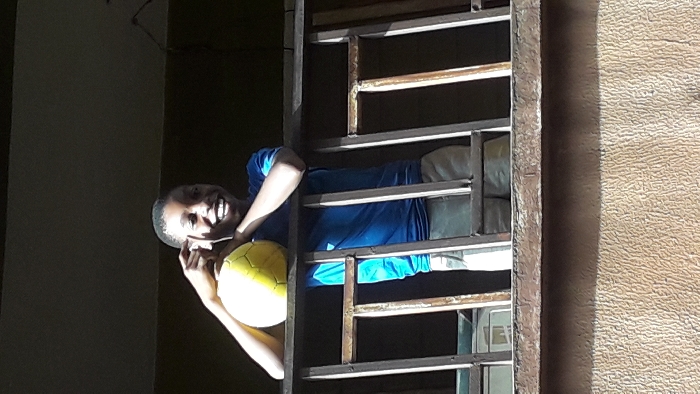In Onitsha, Nigeria, a young male is observed leaning over a dark-painted balcony railing. He wears a blue short-sleeved shirt and light-colored shorts. His face displays a broad smile, revealing teeth, and his gaze is directed forward. A yellow and white soccer ball is held by his right hand, resting on the railing, while his left hand is positioned near his head. The railing consists of vertical slats, some showing signs of wear. Below the railing, a textured, earthy-toned wall is visible. Direct sunlight illuminates the subject, casting shadows behind him.