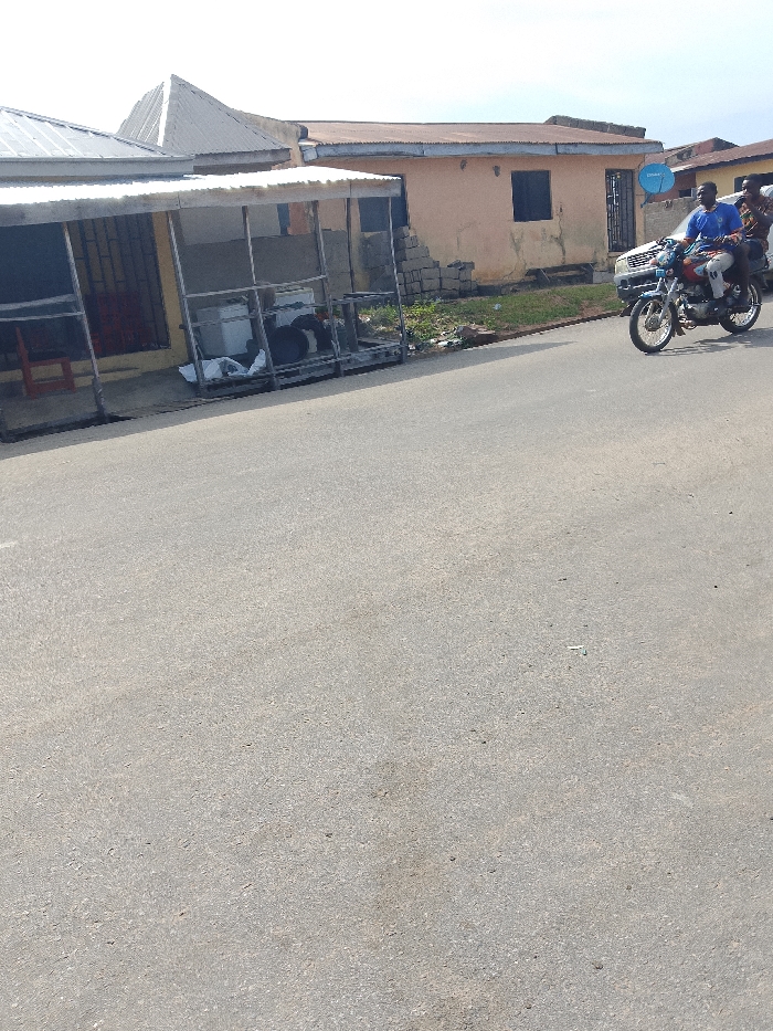 The scene depicts a sunny day on an asphalt road in Lokoja, Nigeria. In the foreground, a gray asphalt road occupies the lower two-thirds of the frame. On the right side of the road, a blue and red motorcycle travels left, carrying two individuals. The rider, dressed in a blue shirt and white pants, is positioned in front of a passenger wearing a patterned shirt. Behind the motorcycle, a white vehicle, likely an SUV, is partially visible. To the left of the road, a roadside stall structure stands with a corrugated metal roof supported by metal framing. Inside the stall, a white refrigerator or cooler is visible, alongside dark objects and possibly shelving. A red plastic chair is situated at the far left under the stall. Behind this stall is a yellow-walled building with a corrugated metal roof and a barred window. Further right, a light peach-colored building features a flat, corrugated metal roof, a dark-framed window, and a metal security door. A blue satellite dish is mounted on its exterior wall. To the left of the window, a section of the wall appears damaged, exposing stacked concrete blocks. Patches of green grass and scattered debris are present on the ground between the road and the buildings. Another building with a darker roof is partially visible in the background. The sky overhead is bright and clear.