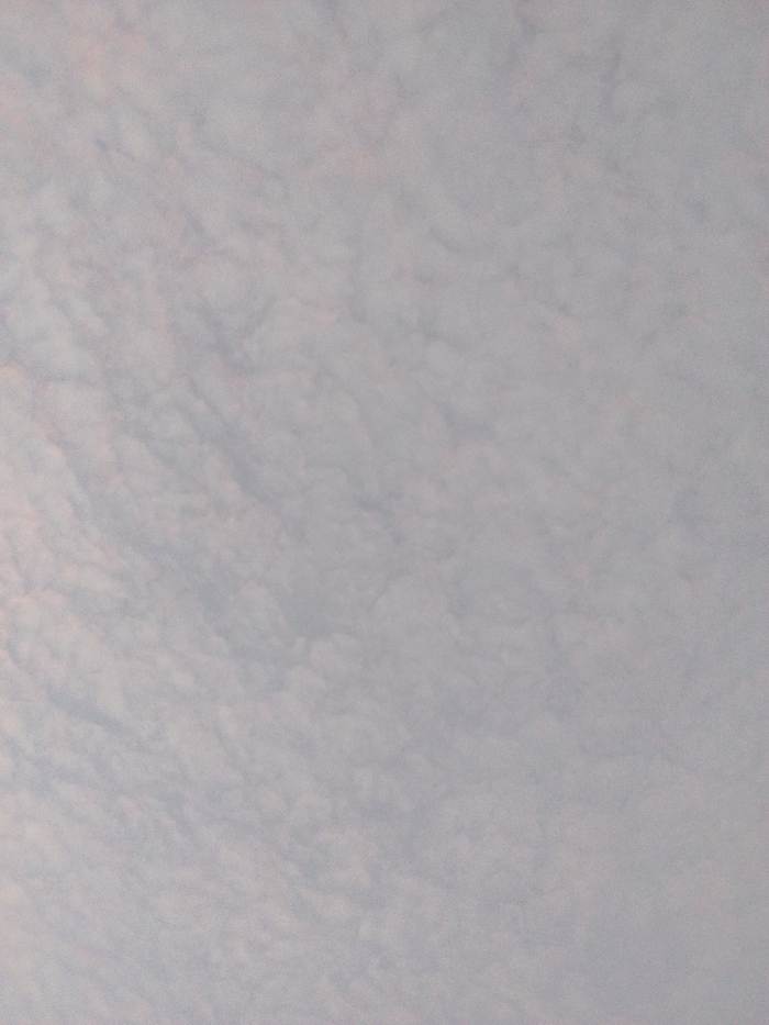 The image displays an overhead view of a sky filled with clouds, observed from Flor Amarillo, Venezuela. The cloud cover is dense and appears to be a uniform layer of altocumulus or stratocumulus clouds, characterized by a textured, undulating pattern. The dominant color is light grey-white, with subtle areas exhibiting pinkish or light orange hues, indicative of diffused sunlight. No ground, structures, vegetation, individuals, or man-made objects are visible within the frame. There are no discernible actions or interactions depicted. The scene consists entirely of atmospheric cloud formations.