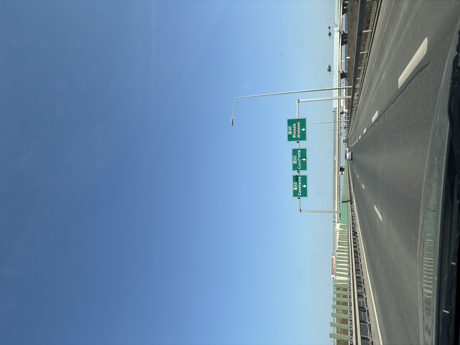 The image depicts a multi-lane highway under a clear, bright blue sky. The viewpoint is from inside a vehicle, with the top of a dashboard visible at the bottom of the frame. The highway features three lanes traveling forward, marked with white dashed and solid lines, and a paved shoulder on the right. Overhead, a green gantry supports three road signs. The two signs on the left indicate "A2 Constanta" with a downward arrow, designating two lanes for that destination. The sign on the far right indicates "A0 Ploiești Urziceni" with a downward arrow, for the adjacent lane. Along both sides of the highway, numerous silver lampposts are visible. To the left, a green sound barrier or fence runs parallel to the road. In the mid-distance, a concrete overpass or bridge spans across the highway. Several vehicles, primarily passenger cars, are visible in the distance traveling in the same direction. Another bridge or overpass structure is visible further in the background to the right. The surrounding environment appears to be relatively flat with sparse, dry vegetation on the verges. Based on the road signs indicating "A2 Constanta" and "A0 Ploiești Urziceni," the scene is located on the A2 motorway in Romania, specifically at or approaching the interchange with the Bucharest Ring Road (A0) on the eastern side of Bucharest, in the vicinity of Glina, Ilfov County, Romania.