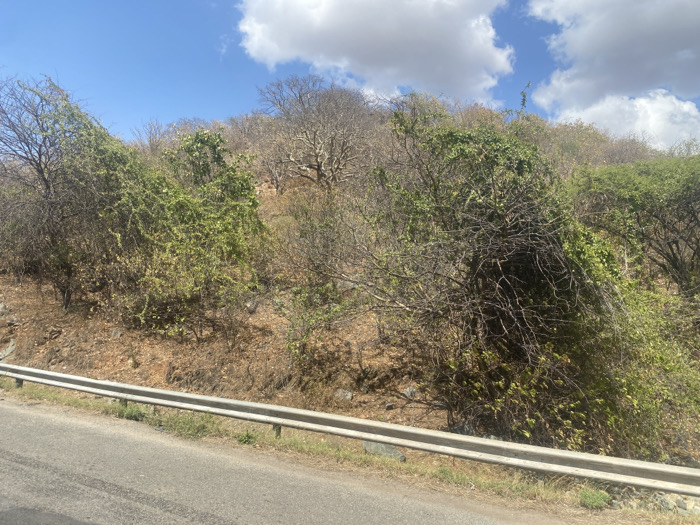 view of a hillside covered in dense vegetation in Muhigiti, Tanzania (latitude: -7.141, longitude: 35.977). There are several trees and bushes, some with green leaves, and others with brown, dried leaves. The ground is covered in dry leaves and dirt. In the foreground, a grey metal guardrail runs along the edge of a paved road. The sky is blue with white clouds. No people are present in the scene.