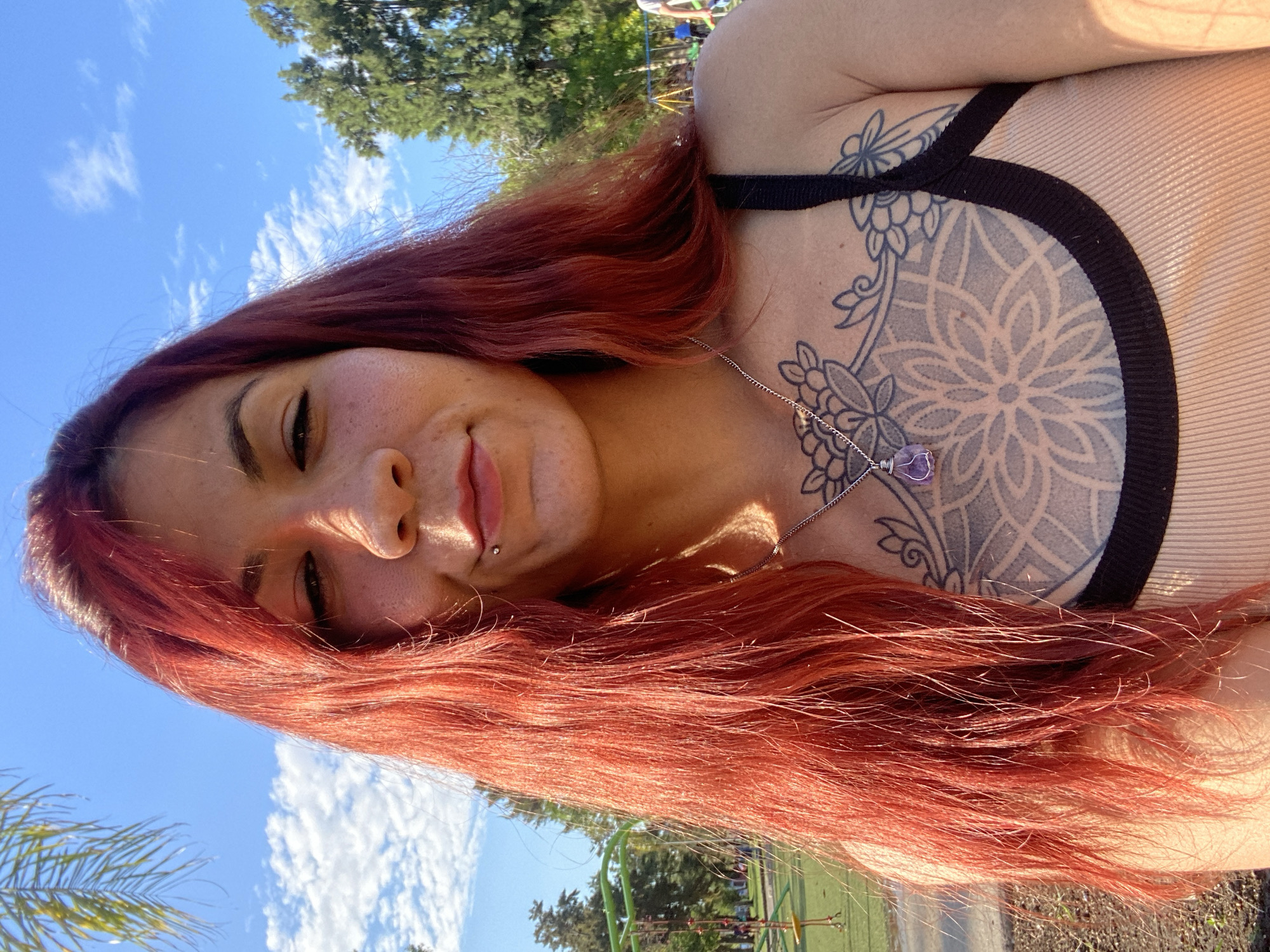 A woman with red hair and a large, intricate tattoo on her chest is taking a selfie outdoors in Villa Domínico, Argentina. She is wearing a light-colored top with black straps. The sky is blue with scattered clouds, and trees and a playground are visible in the background. She has a necklace with a purple stone pendant.