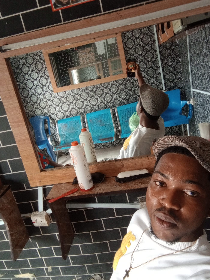 This image depicts the interior of a barber shop or hair salon located in Ughelli, Nigeria