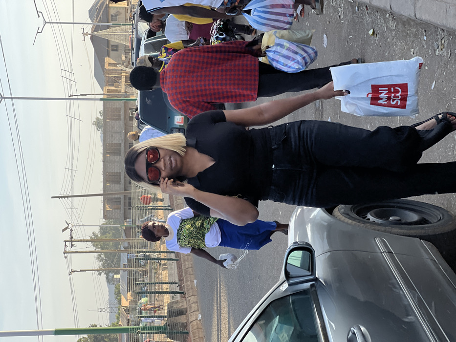 A woman with blonde hair and red sunglasses wears black clothing and holds a white bag with red lettering. She is talking on a mobile phone. Nearby, people are carrying bags. There is a silver car parked next to the woman. In the background, there are utility poles and a building under construction.