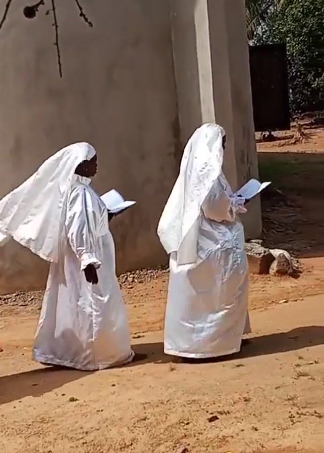 group of women walking in the same direction on a dirt path outside a building. They are dressed in long, white robes, and some have white head coverings. Most of the women carry small books or papers in their hands. The building has a light-colored concrete exterior and arched doorways and windows. The weather appears to be sunny, with shadows visible on the ground. The sound of singing can be heard in the background.