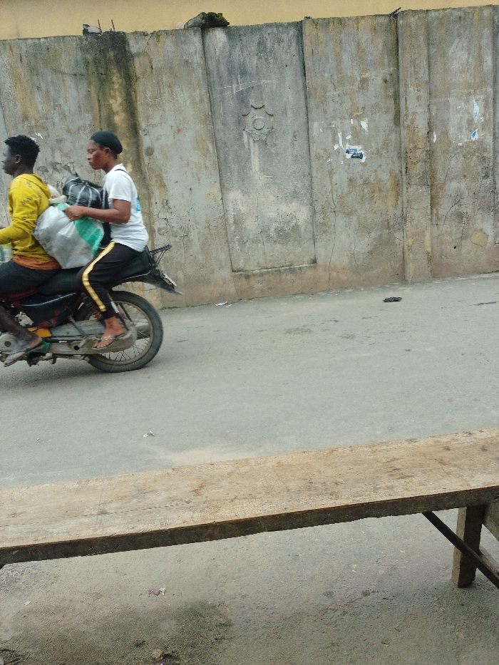 A motorcycle, occupied by two individuals, travels on a paved road in Agani, Nigeria. The driver, a male in a yellow long-sleeved shirt, operates the dark-colored motorcycle. A female passenger, wearing a white t-shirt and black trousers with yellow stripes, sits behind him, holding a large grey bag with green accents and a smaller dark bag. They are positioned against a weathered concrete wall displaying horizontal paneling, stains, and faint circular embellishments, with torn paper remnants adhered to its surface. A light-colored building is visible above the wall. In the immediate foreground, a long, rough wooden bench extends horizontally across the lower portion of the frame. Debris is visible on the road surface and the ground near the bench.