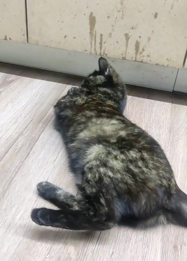 A tortoiseshell cat is lying on its side on a light brown wooden floor near a cream-colored baseboard and wall. The cat is mostly dark brown and black with some lighter yellowish-brown fur scattered throughout. It first has its back to the camera and is looking up towards the wall. The cat then raises its front right paw up in the air and turns its head to look at the camera.