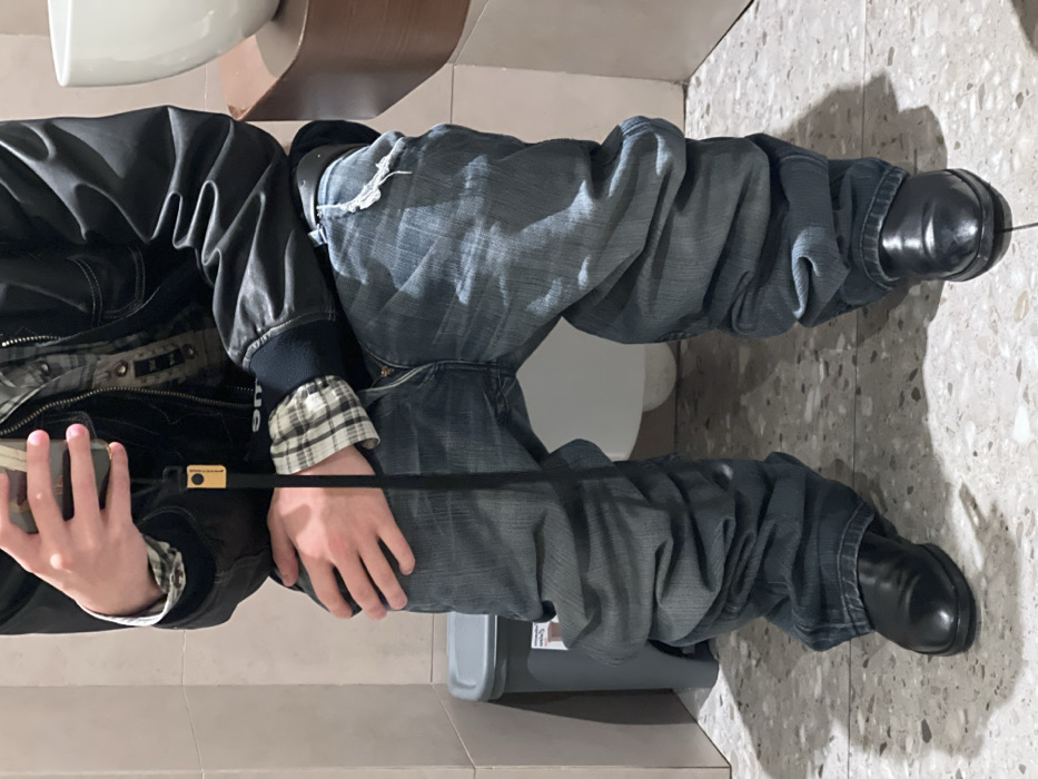 The image depicts an individual seated on a toilet within a restroom environment. The specific location in Florence, Italy, is not discernible from the visual information provided. The individual is seen from the mid-torso down, wearing a dark bomber-style jacket over a plaid shirt, dark blue denim jeans, and black leather shoes. The jeans are significantly wrinkled, particularly at the lower legs, and exhibit a small tear on the upper right thigh. The trouser fly appears partially unzipped. The individual's right hand holds a smartphone, its camera lens facing the viewer, indicating a self-portrait capture. A black lanyard with a gold-colored rectangular attachment hangs vertically from the phone. The individual's left hand rests on their left thigh. The restroom features a light-colored, speckled tiled floor and light beige square wall tiles. A gray plastic waste bin with a lid is positioned to the left of the toilet. A white ceramic toilet bowl is visible. To the right, a portion of a white ceramic basin rests on a light brown wooden or laminate countertop.