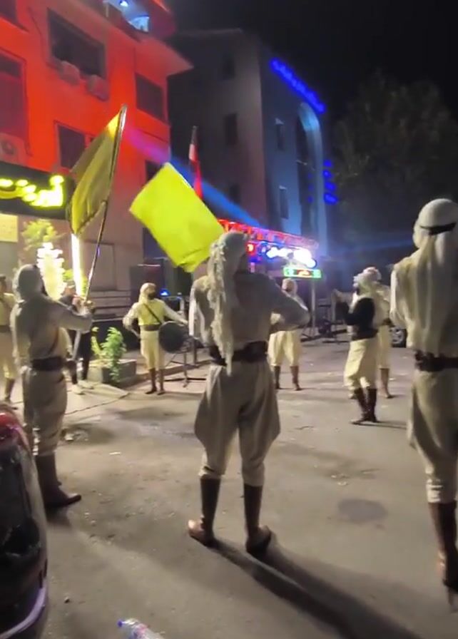At night, a group of men stand on a paved road next to a black car, performing with flags and drums in front of a lighted stage. The men wear tan uniforms with head coverings and brown boots, some holding yellow flags that they wave and twirl. One man plays a drum. In the background are buildings with lit signs and string lights. Debris, including a water bottle and paper, litters the road. Blue spotlights shine from the stage towards the performers. A small group of people watch from the sidewalk near a building with a yellow sign.