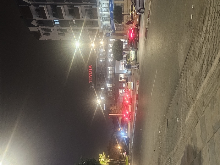 Night scene showcases a multi-story building adorned with a prominent "TOYOTA" sign. A street with multiple vehicles lines the side of the building. Streetlights illuminate the scene and emphasize the urban environment. A wide pedestrian sidewalk is on the right side of the street.