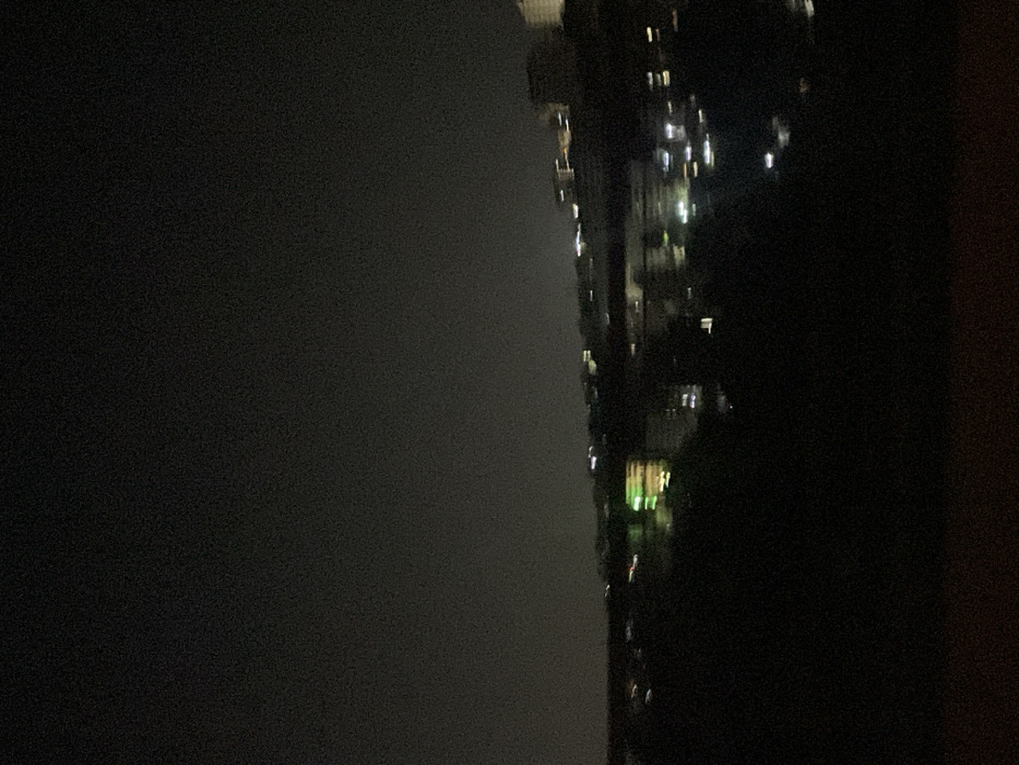The image displays a nighttime panoramic view of the city of Al-Hama, Syria. The upper two-thirds of the frame are occupied by a dark, heavily pixelated sky. Below the sky, a blurred cityscape extends across the horizon. Multiple buildings of varying heights are visible, illuminated by scattered lights. A prominent cluster of bright green lights is present on a structure in the mid-left portion of the frame. Numerous additional white and yellow lights, consistent with building windows or streetlights, are distributed throughout the urban landscape. All visible light sources exhibit horizontal streaking, indicative of motion blur. The foreground and lower mid-ground consist of indistinct dark masses, likely foliage or lower structures, further obscured by darkness and blur. No discernible individuals or specific actions are visible within the frame. The perspective suggests an elevated vantage point.