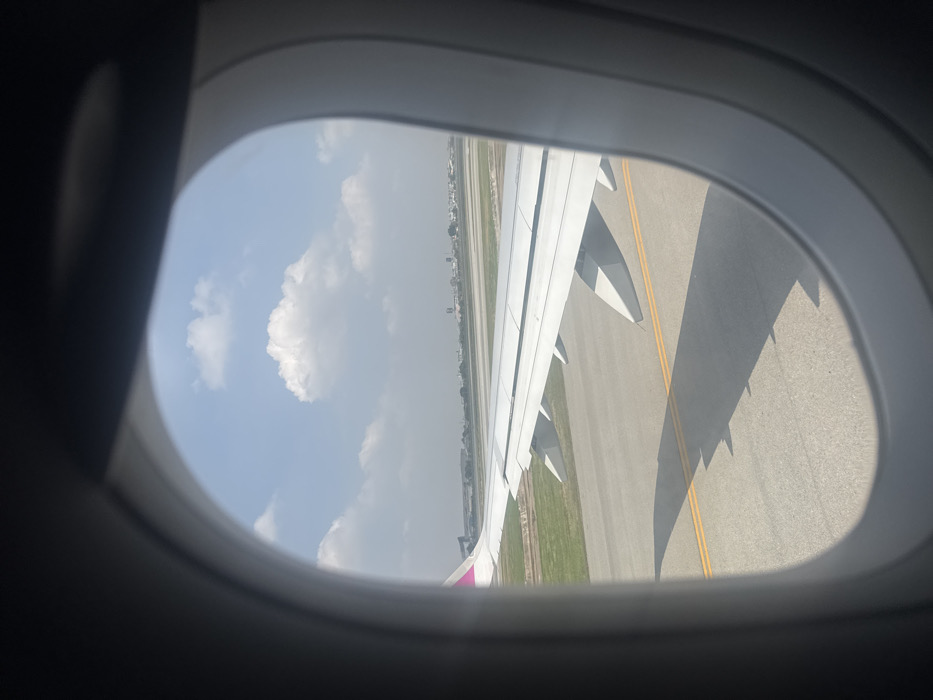 - "An exterior view captured through an aircraft passenger window shows a bright white airplane wing extending across the mid-ground" by FM-M5A4l2, licensed under CC BY 4.0