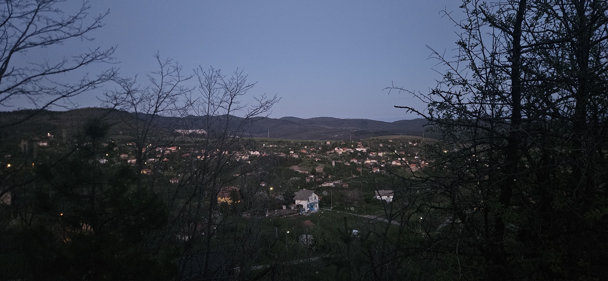 A dusk scene captures a village nestled among rolling hills, viewed through trees. Houses with illuminated windows dot the landscape, contrasting with the darkening sky and the silhouette of distant mountains. Bare branches of trees frame the scene on both sides, adding depth and a sense of enclosure. The overall mood is calm and serene, with a touch of mystery due to the low light.
