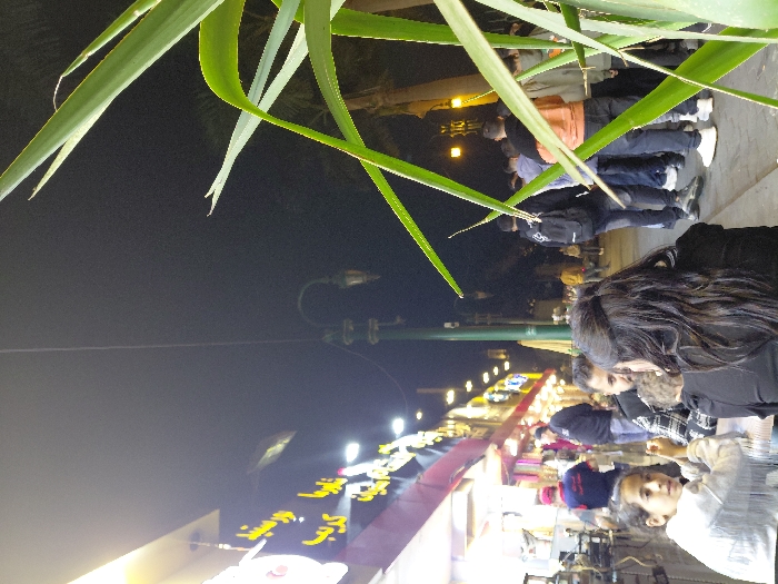 A street scene at night, viewed through green foliage. People stroll along a brightly lit promenade with businesses lining the street. Focus is on a group of people in the foreground, likely a family, gathered near some sort of food stand or restaurant. The streetlights and business signs cast a warm glow on the scene.