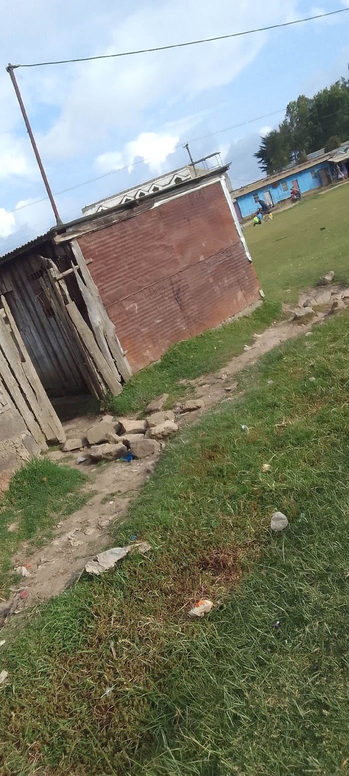 The image displays an outdoor scene in Heni Village, Kenya, under a partly cloudy sky. In the foreground, a dilapidated, single-story structure is present, its right-facing side constructed from rusted, reddish-brown corrugated metal, and its left-facing side and an open entryway made from weathered, light-colored wooden planks. A narrow dirt path with scattered small debris and a cluster of large, irregular stones runs diagonally from the lower-left corner past the structure's entrance. The path is bordered by patchy green and brown grass that extends across the midground. A tall, slender utility pole stands behind the structure on the left, with a horizontal wire spanning the upper portion of the frame. In the background, beyond the grassy area, several single-story buildings with light blue painted walls and corrugated metal roofs are visible. Small figures, including at least one individual wearing a bright green top, are discernible on the grass near these distant buildings. Trees are visible on the horizon behind the blue structures.