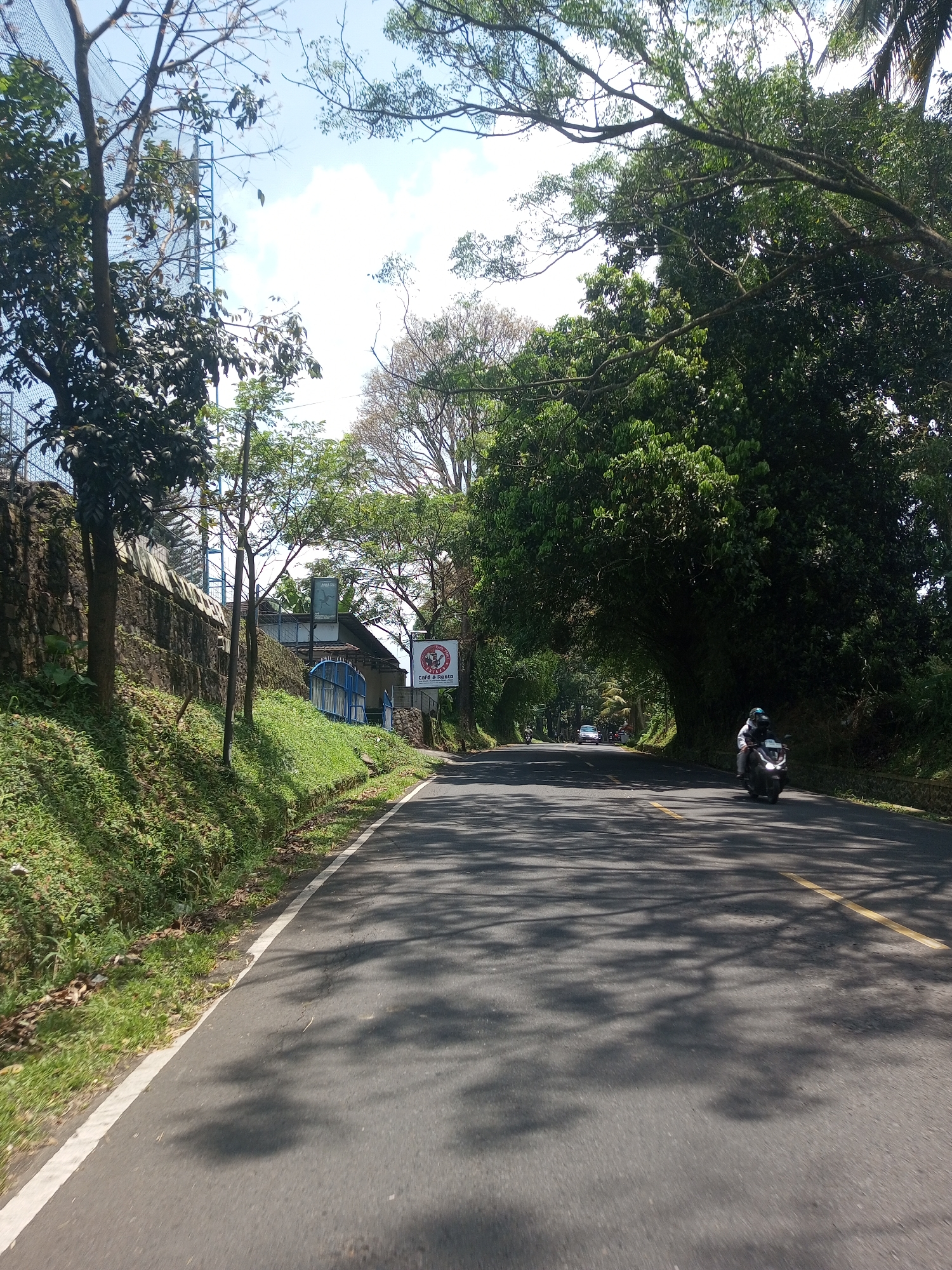A sunny outdoor scene depicts a paved road winding through a lush, green landscape. A motorcyclist is riding on the right side of the road, while a few vehicles are visible in the distance, near an area where the road is shaded by trees forming a natural canopy. On the left side of the road, a stone wall runs along an embankment covered in grass, with trees and vegetation growing above it. Further back, a building structure is partially visible, possibly indicating a residential or commercial area nearby. The scene suggests a rural or suburban setting, possibly in Nawng Hkar, Myanmar.
