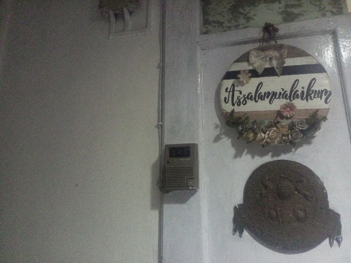 An interior scene in a residential or commercial building in the city of Ciherang, Indonesia, depicts a segment of an off-white wall on the left and a white door on the right. The off-white wall displays a rectangular utility box with two hooks mounted in the upper-left quadrant. A light-colored conduit runs vertically down the wall, secured by white clips, intersecting the space between the wall and the door frame. Adjacent to the conduit, on the wall to the left of the door frame, a beige, rectangular intercom or doorbell unit is affixed. This unit features a speaker grille and a small digital display showing the number "25". The white door is adorned with two circular decorative items. The upper decoration is a circular sign with horizontal stripes in white, beige, and black. Black script spelling "Assalamualaikum" is centered on the sign. A beige lace bow is attached to the top, and a wreath of artificial flowers and foliage, in shades of green, brown, pink, and cream, encircles the lower half of the sign. Below this, a second, darker circular plaque is mounted. This plaque is dark brown, appears to be made of a textured material, possibly woven or carved, with an embossed, unidentifiable pattern, and features fringed elements along its bottom edge. No individuals, actions, or interactions are present in the image.