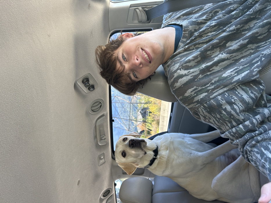 A selfie-style photograph depicts a young male and a dog inside a vehicle, located in the city of Area D (Elaho/Garibaldi), Canada