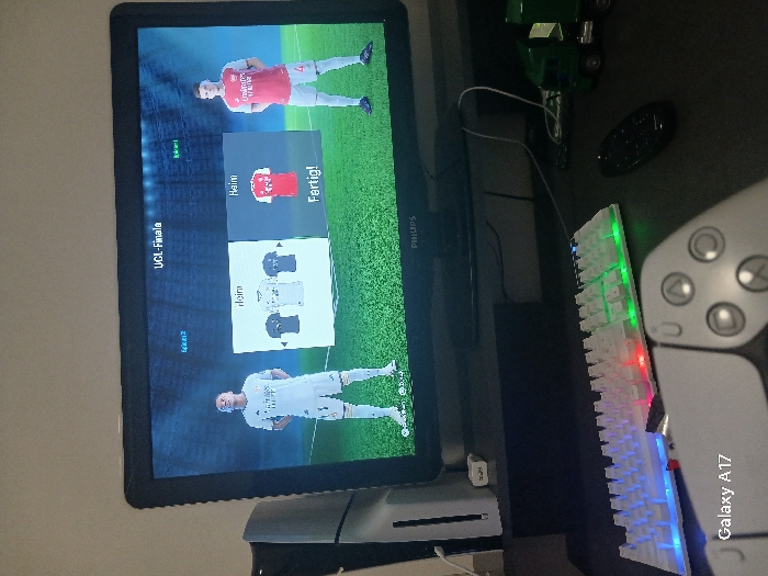 The image displays an indoor gaming setup on a dark desk within a residence in Frankfurt, Germany. A Philips monitor centrally presents a video game interface for a "UCL-Finale" (UEFA Champions League Final). On the left side of the screen, a virtual player in a white Real Madrid kit is shown. On the right, a virtual player in a red Arsenal kit stands. Between them, kit selection options are displayed, with the red Arsenal "Heim" (Home) kit selected, indicated by "Fertig!" (Done!). To the left of the monitor, a white PlayStation 5 console stands vertically. In the foreground, a white mechanical gaming keyboard illuminates with multi-colored RGB backlighting. Partially visible in the extreme foreground, a white PlayStation 5 DualSense controller rests on the desk. To the right of the keyboard, a black remote control is present. Further to the right, two green toy trucks are visible. Various cables are discernable behind the keyboard and remote, connecting devices. No individuals are depicted in the scene. The bottom left of the image contains a "Galaxy A17" watermark.