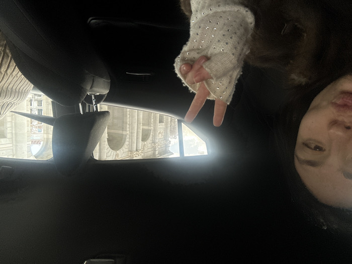 The image captures the interior of a vehicle, likely from a rear passenger seat, looking forward and right