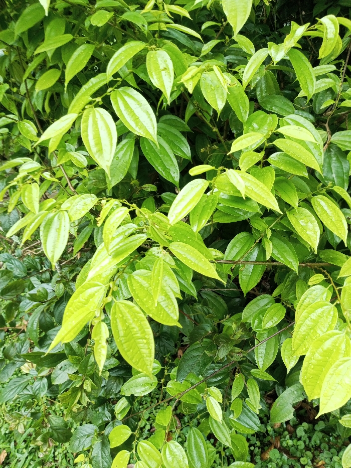 Lush greenery thrives, dominated by glossy, vibrant green leaves. The foliage varies in size, displaying elongated, oval shapes with prominent veins. Water droplets cling to the surfaces, suggesting a recent rain. The overall impression is one of healthy, dense plant growth, filling the frame with a variety of textures and shades of green. A few darker branches are visible among the leaves.