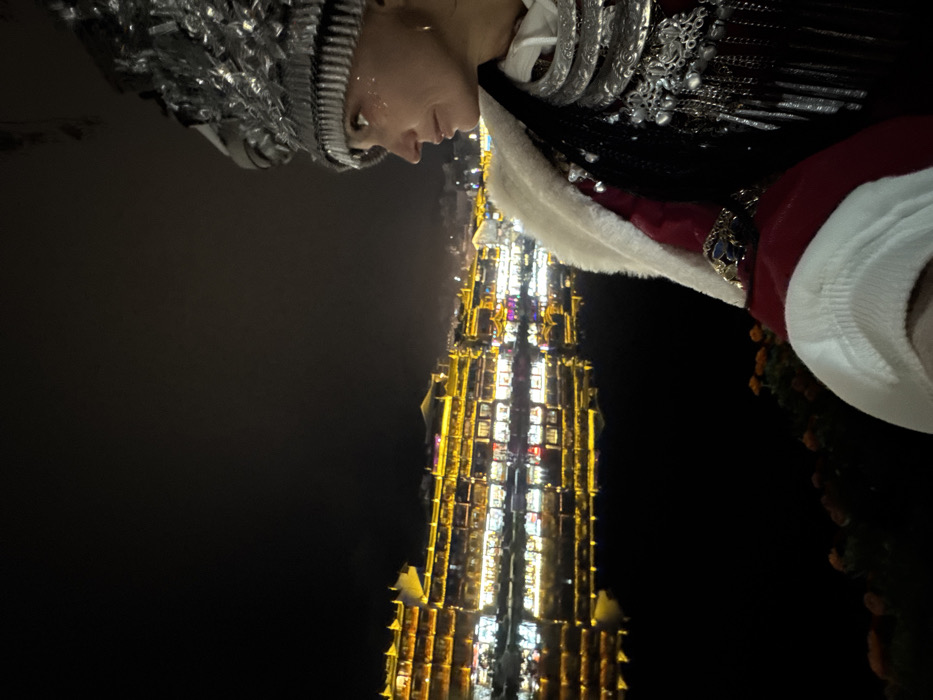 The image depicts an adult female in profile, positioned on the right side of the frame, gazing towards a vibrant night cityscape. She wears an elaborate silver-colored headdress with textured, layered elements and intricate silver-toned jewelry, including a large multi-strand necklace and a brooch with a blue stone on her red garment, which features a white fur collar and sleeve trim. Small, reflective specks are visible on her left temple and cheek. The background features the illuminated city of Fenghuang, China, specifically its riverside architecture. Multi-story buildings with traditional Chinese-style roofs are brightly lit with yellow and orange lights, lining the far bank of a dark body of water, likely the Tuojiang River. The city lights are clearly reflected on the water's surface. The sky is dark and featureless. Dimly lit orange foliage is visible in the lower foreground.