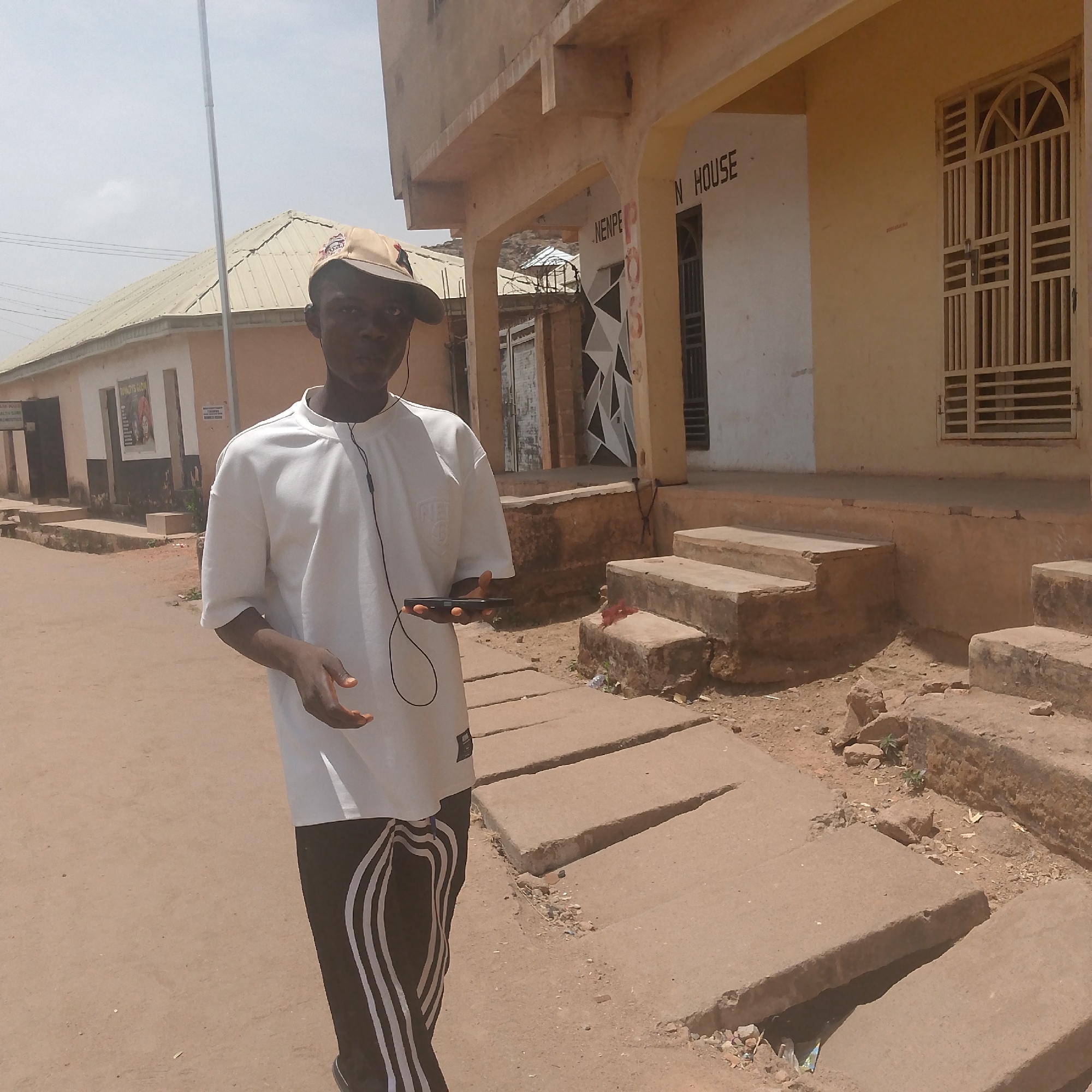 A young man stands on a street in Gura Top, Nigeria. He wears a white t-shirt with black track pants and a baseball cap. He has earphones in and holds a smartphone in his left hand. The street is unpaved and lined with buildings. To the right, a building with "N HOUSE" on the side has a set of concrete steps leading to the entrance. Another building is across the street, and a rooftop is visible in the background. The sky is overcast.