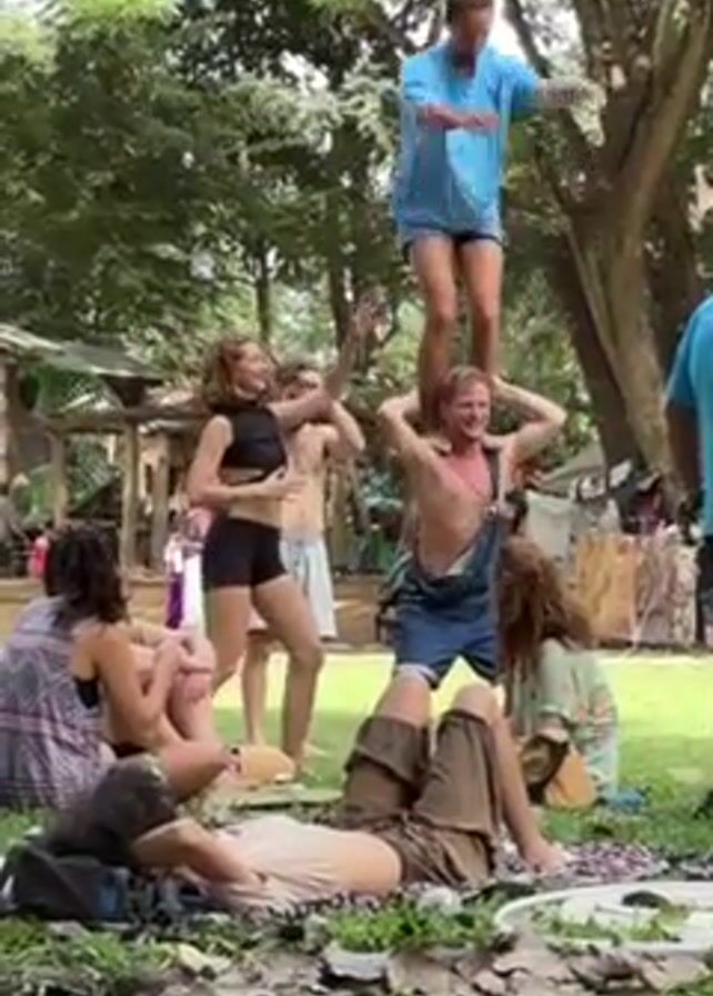A group of people are gathered outdoors on a grassy area, with trees in the background. A man in a blue t-shirt and shorts stands on another man's shoulders. The man below is wearing denim overalls. Both men have their arms raised. Several other people are watching, some sitting on the grass, and others standing. One woman in a black top and shorts has her arms raised as well. In the background, there's a small structure and other people moving around.