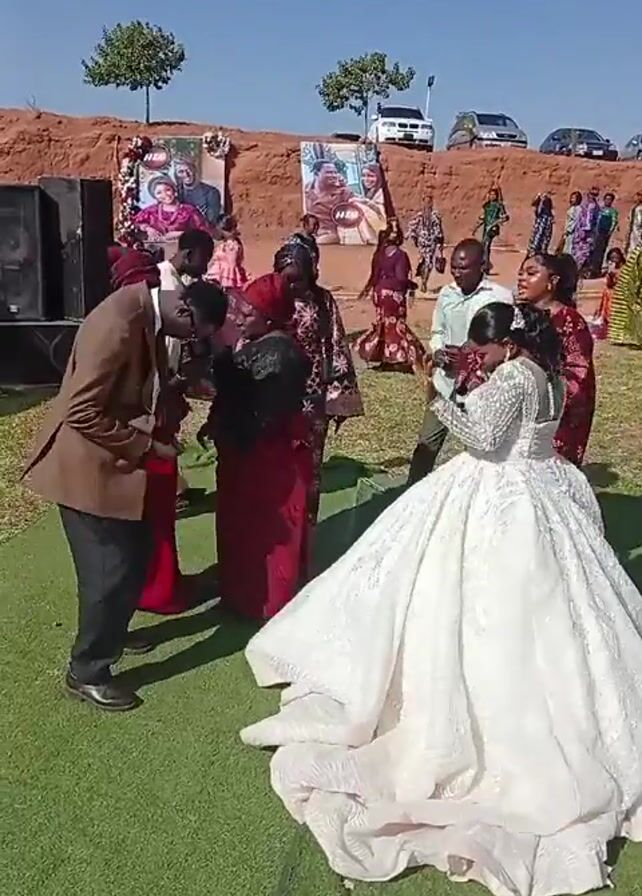wedding celebration taking place outdoors. A bride in a large white gown is standing on a green lawn surrounded by a group of guests. Some of the guests are handing her money. There are two large posters with portraits of couples on a dirt bank in the background, as well as cars parked behind them. The day appears bright and sunny. A speaker is visible on the left. The bride appears to be crying.