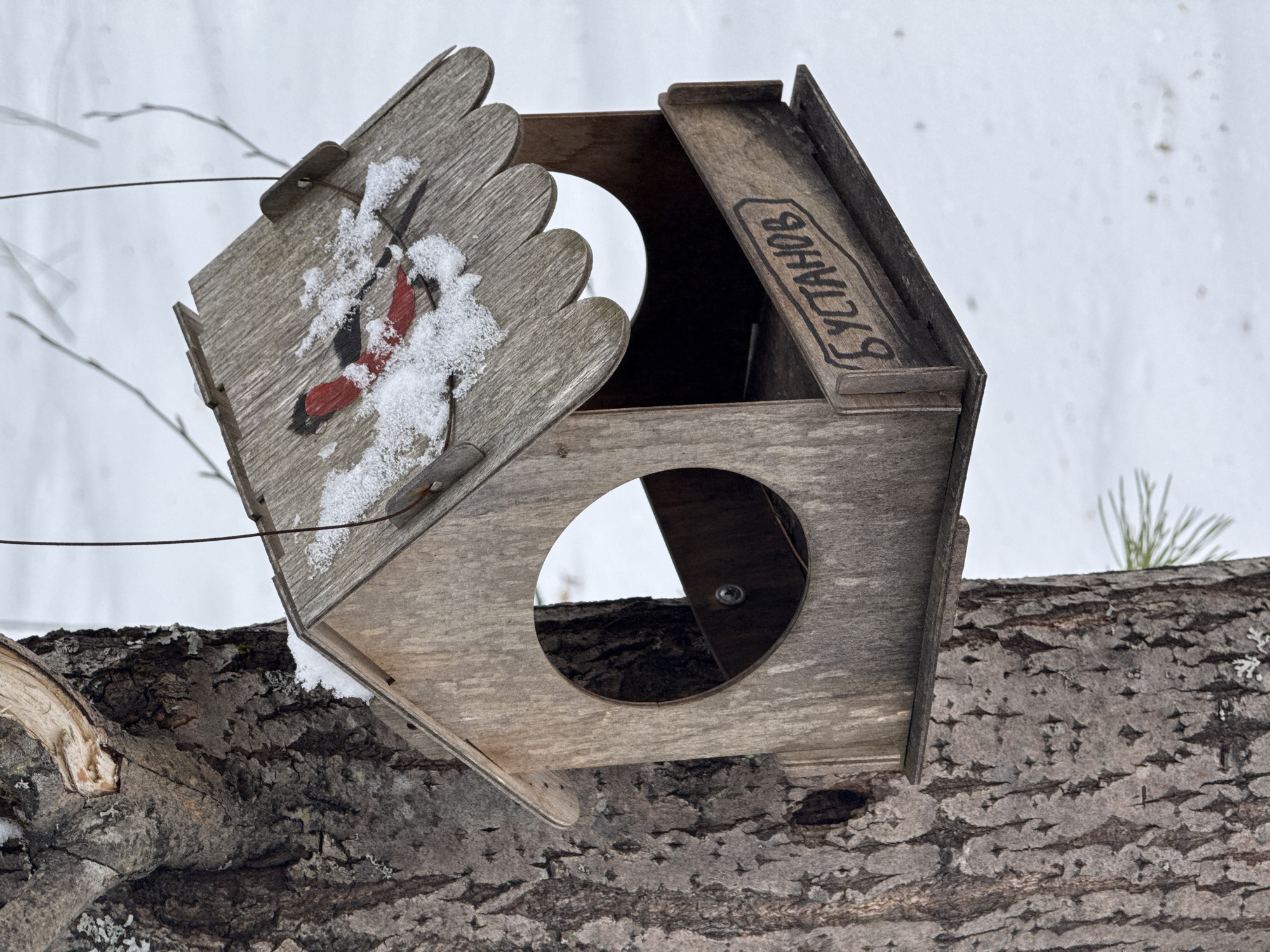 A wooden bird feeder, hexagonal in shape, is mounted on a tree branch. The feeder has an open top, and a circular opening on one side. The front of the feeder has a decorative wooden design reminiscent of bird wings, upon which there's a faded illustration of a woodpecker, partially covered with snow. The inscription "БУСТАНОВ" is visible on the right side panel. The tree branch, covered with lichen and moss, supports the feeder against a backdrop of snow. The photo location could be Izluchinsk, Russia, based on the Cyrillic inscription.