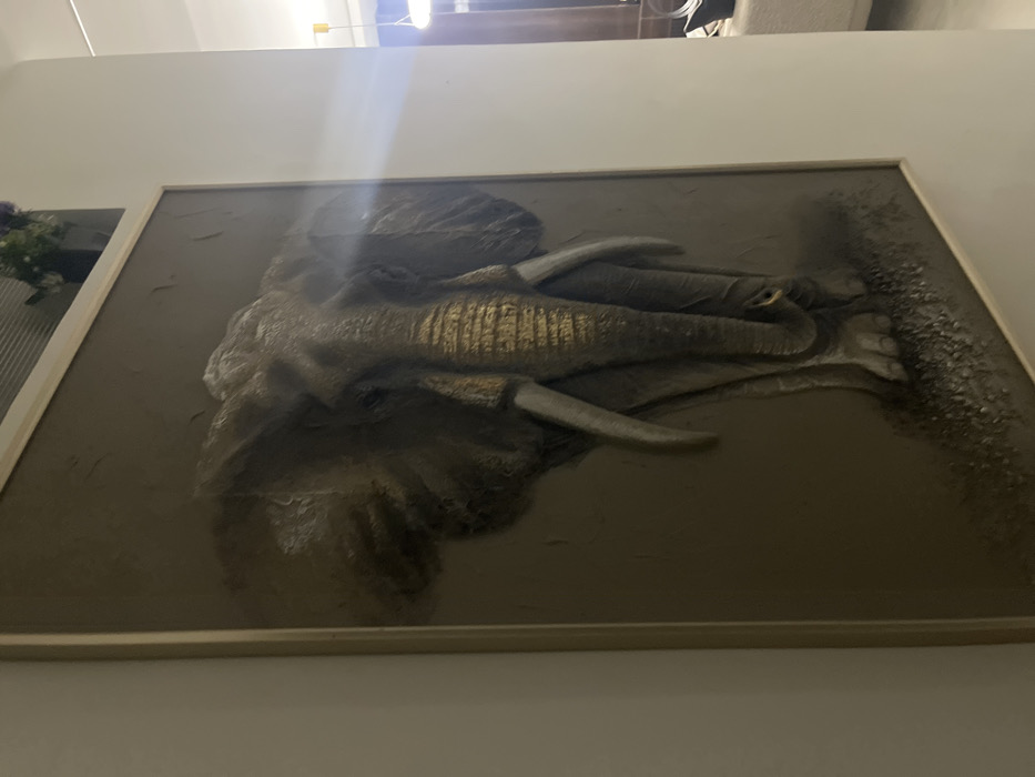 The scene is an interior view within a residence located in Gwarinpa, Nigeria. A large, vertically oriented, framed three-dimensional artwork depicting an elephant is mounted on a plain, light-colored wall. The elephant, rendered in bas-relief, faces forward with its trunk curled downwards, exhibiting textured skin and prominent, light-colored tusks. Metallic gold accents are visible on the elephant's trunk and parts of its head. The artwork's background is a textured dark grey. The frame is a slender, light-colored material. Above the artwork, a white shelf supports a dark vase containing artificial purple and green flowers, positioned against a corrugated backdrop. To the right of the artwork, an open doorway reveals a brightly lit interior space with light-colored furnishings and a suspended light fixture featuring a yellow accent. No individuals are present in the image. A strong horizontal light flare traverses the upper right quadrant of the image.