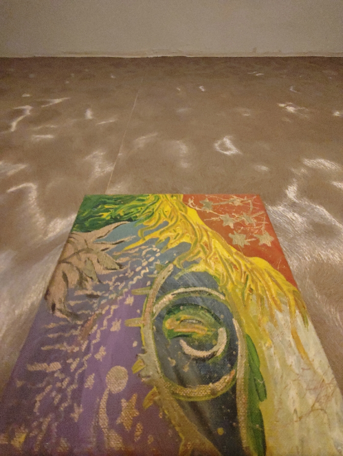 An oil painting lies on a reflective tile floor. The artwork features a spectrum of colors, from green and yellow at the top to shades of blue and purple below. A stylized eye, encircled by a gold spiral, dominates the composition. Red and gold star motifs decorate one corner. The perspective creates an illusion of the painting extending into the horizon.